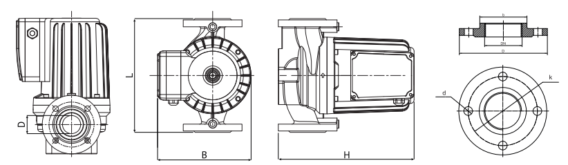 | Модель | L, мм | H, мм | B, мм | DN | D, мм | k, мм | d, мм | Тип фланца |