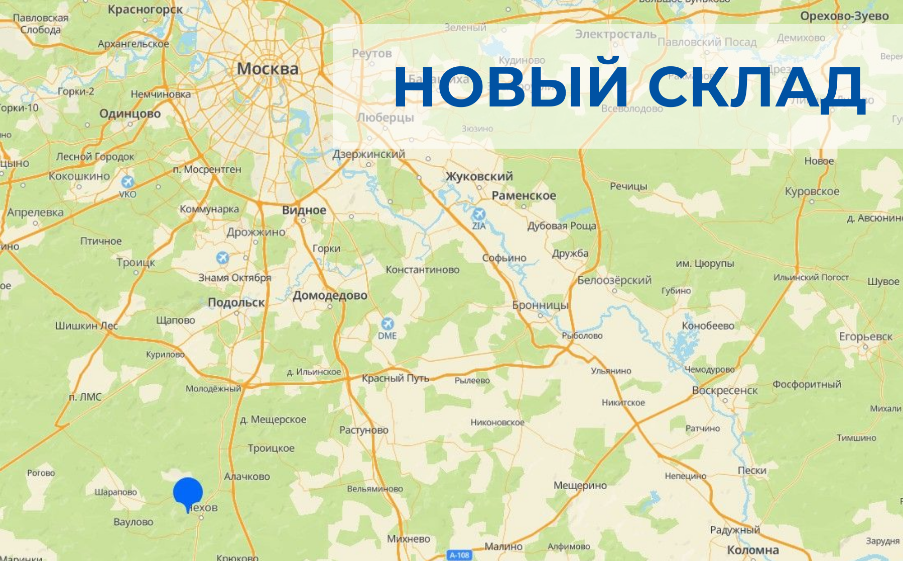 Сообщаем, что мы меняем склад в Москве. Вместо склада Москва-Котельники теперь в Московской области будет доступен склад Москва-Чехов (Московская область, Чехов, Венюково м-н, ул. 8 марта, вл. 2).
